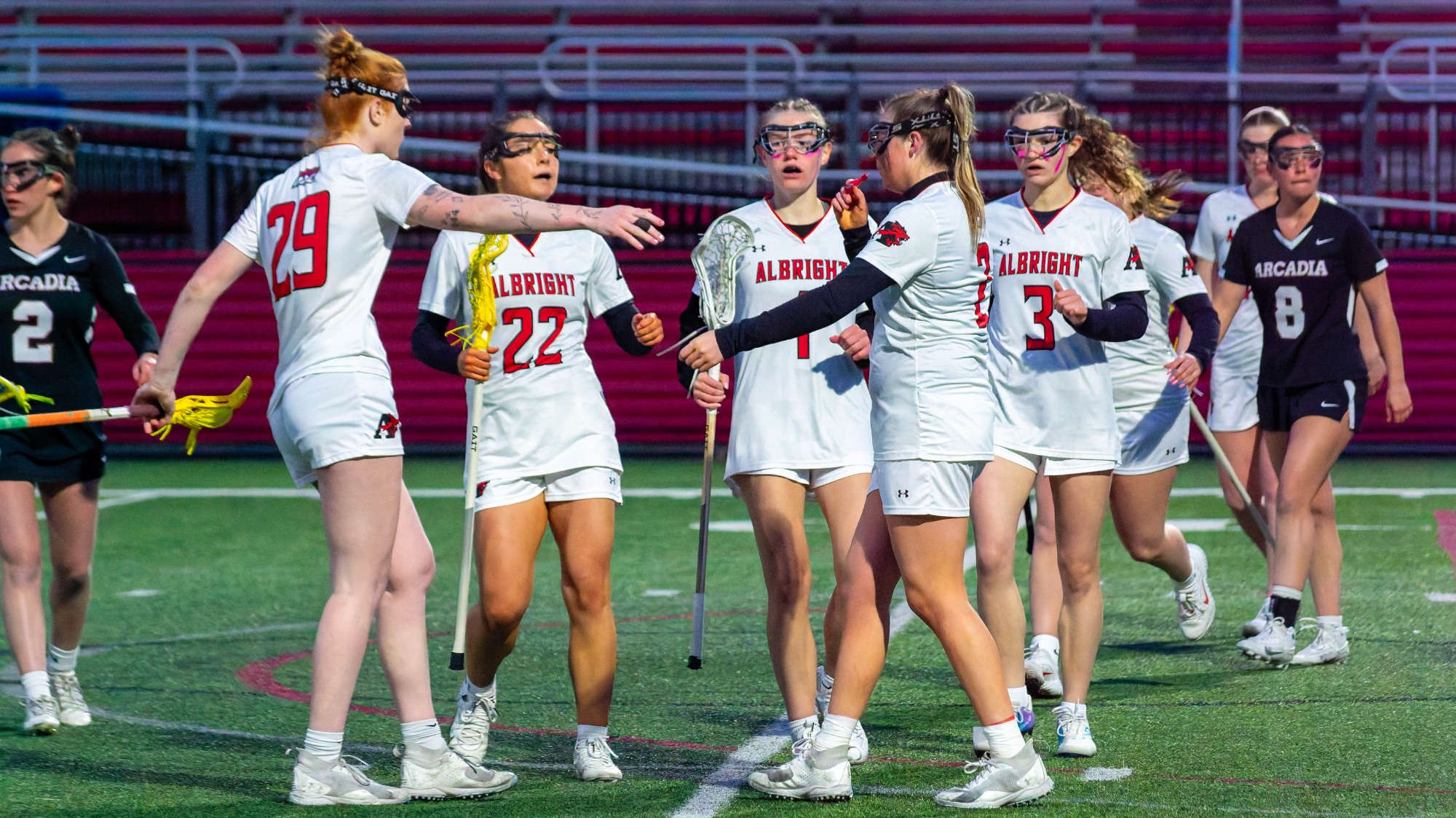 Roman, Smith (free position) and Meyer scored three unanswered for Albright, and the Lions would then tally four consecutive goals to take a 9-2 lead with 9:32 remaining before halftime.